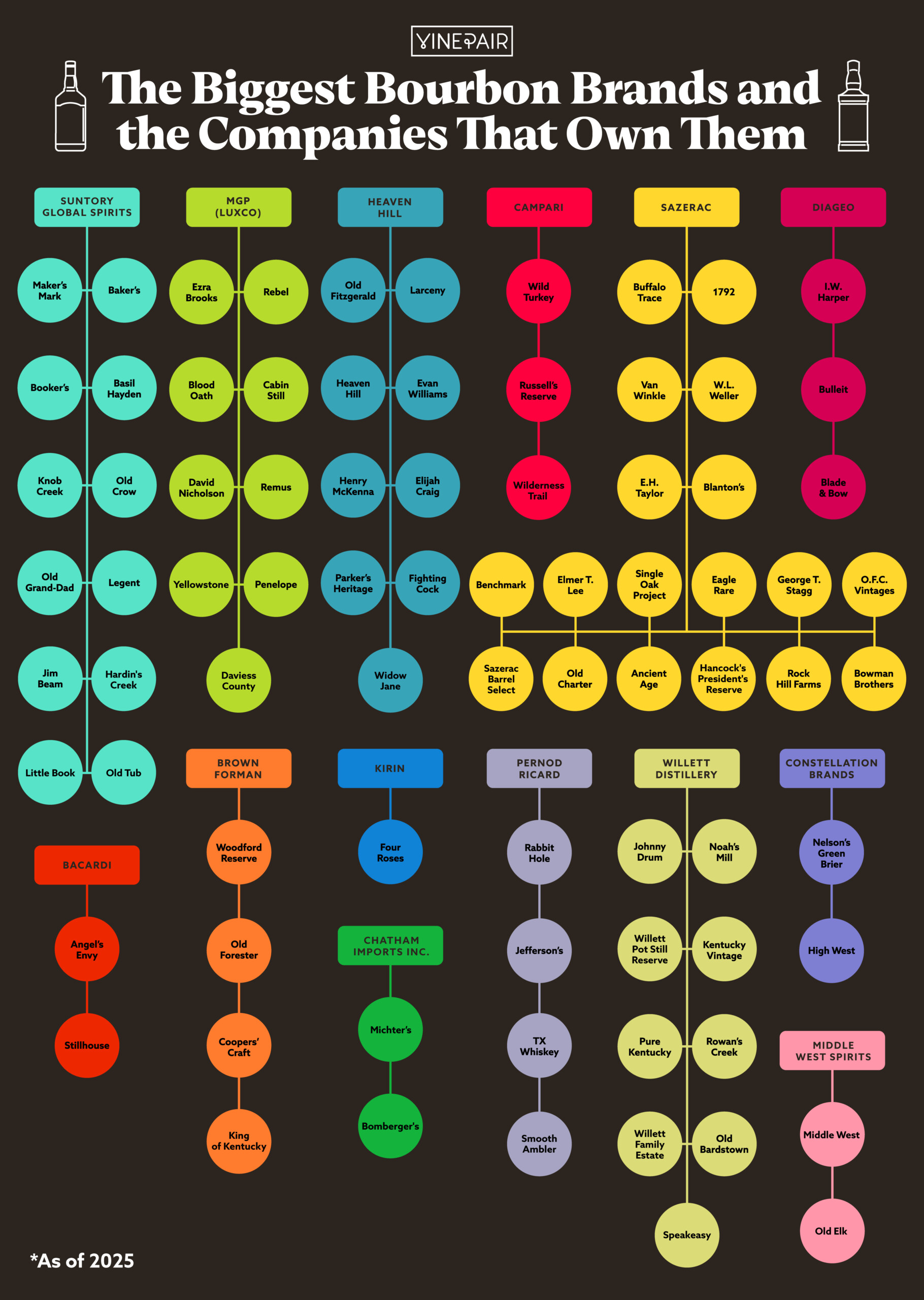 To make the vast bourbon market a bit easier to understand, we produced this infographic identifying the biggest names in bourbon and the companies that own them. In order to narrow things down, we did not include any independently-owned brands, which is why you’ll notice bourbons like Frey Ranch, New Riff, and Laws are missing.