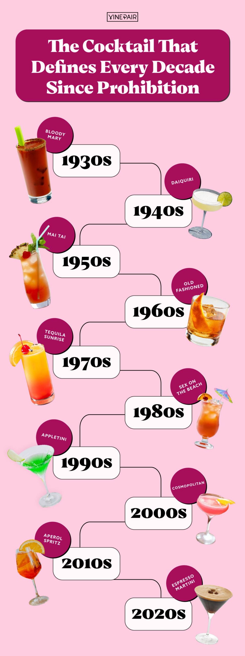 There are several cocktails that can claim “cocktail-of-the-decade” status within a given 10-year period; however, a handful of drinks stand out as particularly emblematic of a given time, both at the bar and beyond. This article humbly aims to pinpoint these special drinks.