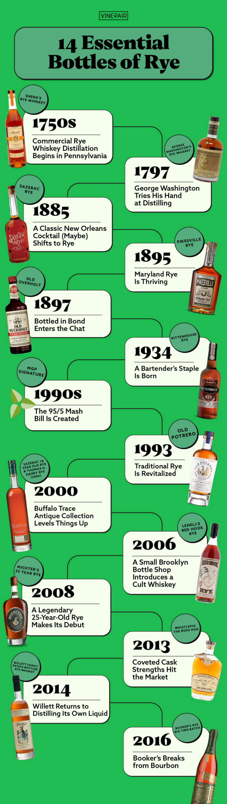 In order to track the spirit’s progression over the centuries, we’ve compiled this timeline of watershed moments in the history of rye whiskey, with specific bottles tied to each. From Old Overholt and Rittenhouse Rye to LeNell’s and Willett Family Reserve, here are 14 rye whiskeys that have shaped the category.