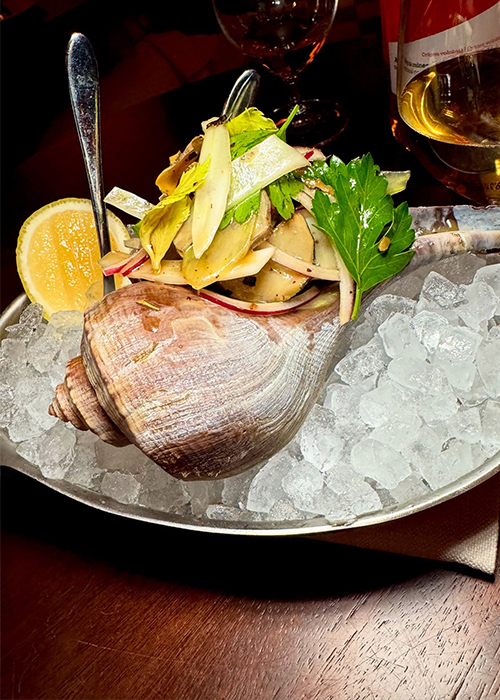 To prepare the scungilli dish, the meat is braised in a court bouillon broth, which is often used to poach fish in French cuisine. It is then thinly sliced, combined with crunchy celery and red onion, and served chilled in a spiraling conch shell, soaking in a generous pool of court bouillon.