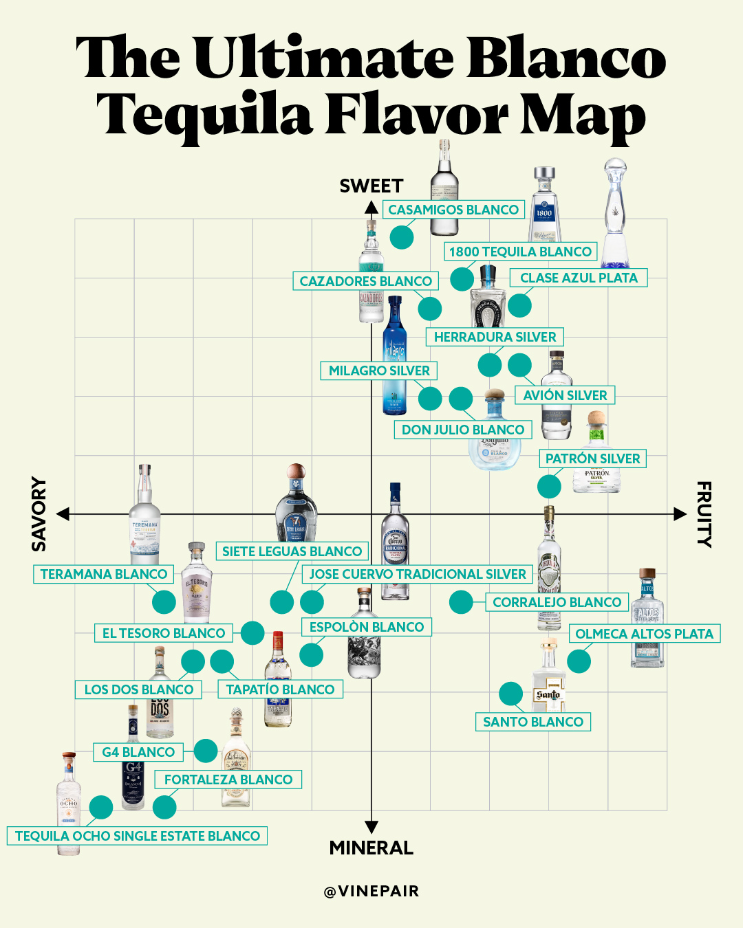 Even if you’ve nailed down your ideal flavor profile, with more artisanal brands popping up every day in an already saturated market, picking one off the shelf can be tricky. No matter what your preference, this chart can help you nail down which type of tequila you gravitate toward or further guide you on your journey to discover your next favorite blanco.