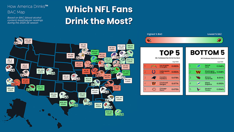 BACtrack released its report of fan bases’ drinking habits just five days ahead of Super Bowl LX, the yearly apex of both sports and drinking cultures. The breathalyzer company corralled over 26,000 anonymous blood alcohol content (BAC) results logged into its app during the 2025-26 season. To associate a locale’s average BAC to a fan base, BACtrack compared its data against an online NFL Fan Map database created by an analyst named Matt Sorenson.
